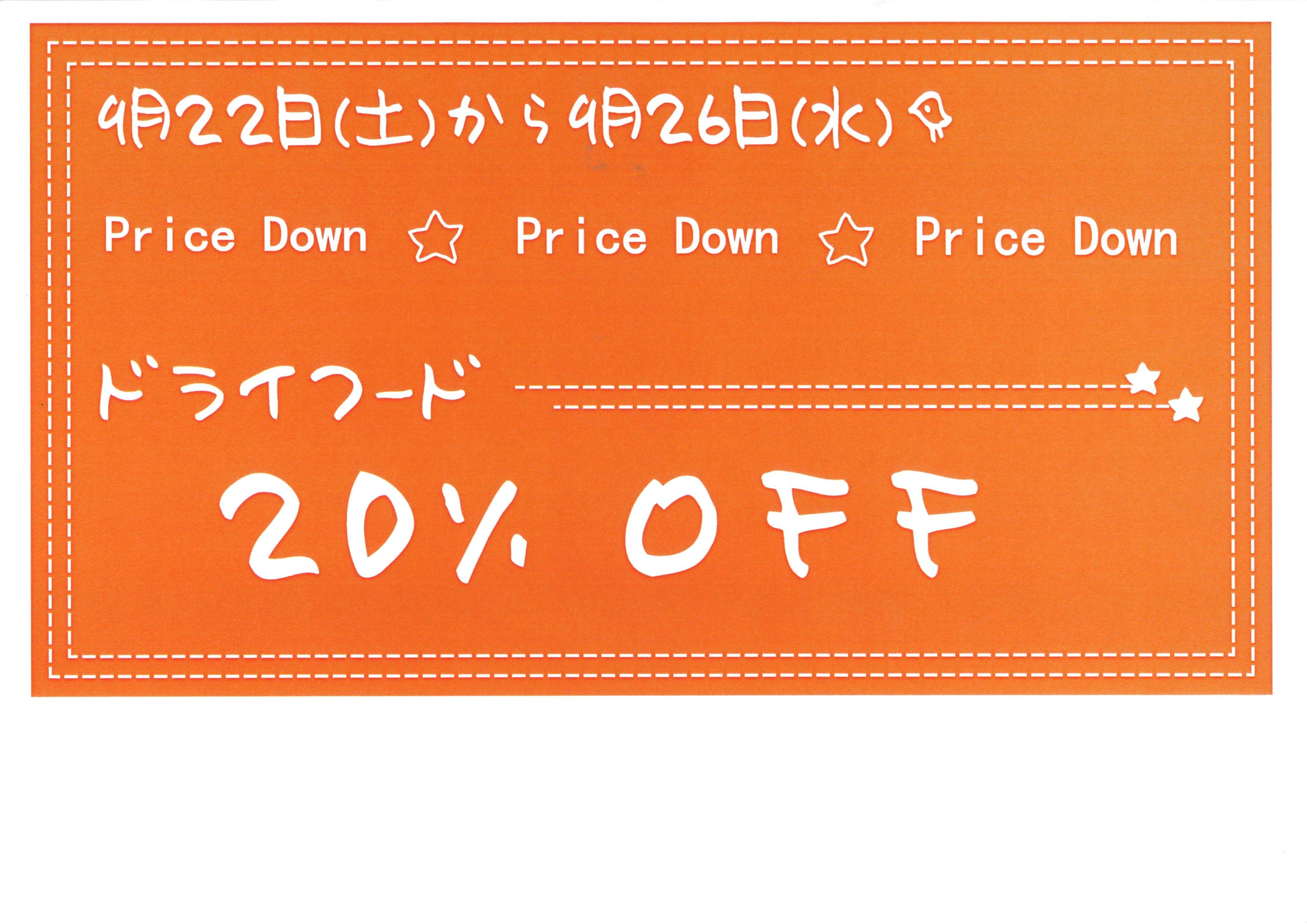みなさんこんばんは!ワンダードック岩見沢店で行われるセールのお知らせです。期間中、ドライフードを20%OFFでご提供させて頂きます!!この機会に是非、お買い求め下さい!また、わくわくワンダー秋祭りも同時開催中です。総勢50頭以上のわんちゃんねこちゃんが大集合しています☆皆様のご来店を心よりお待ちしております!!