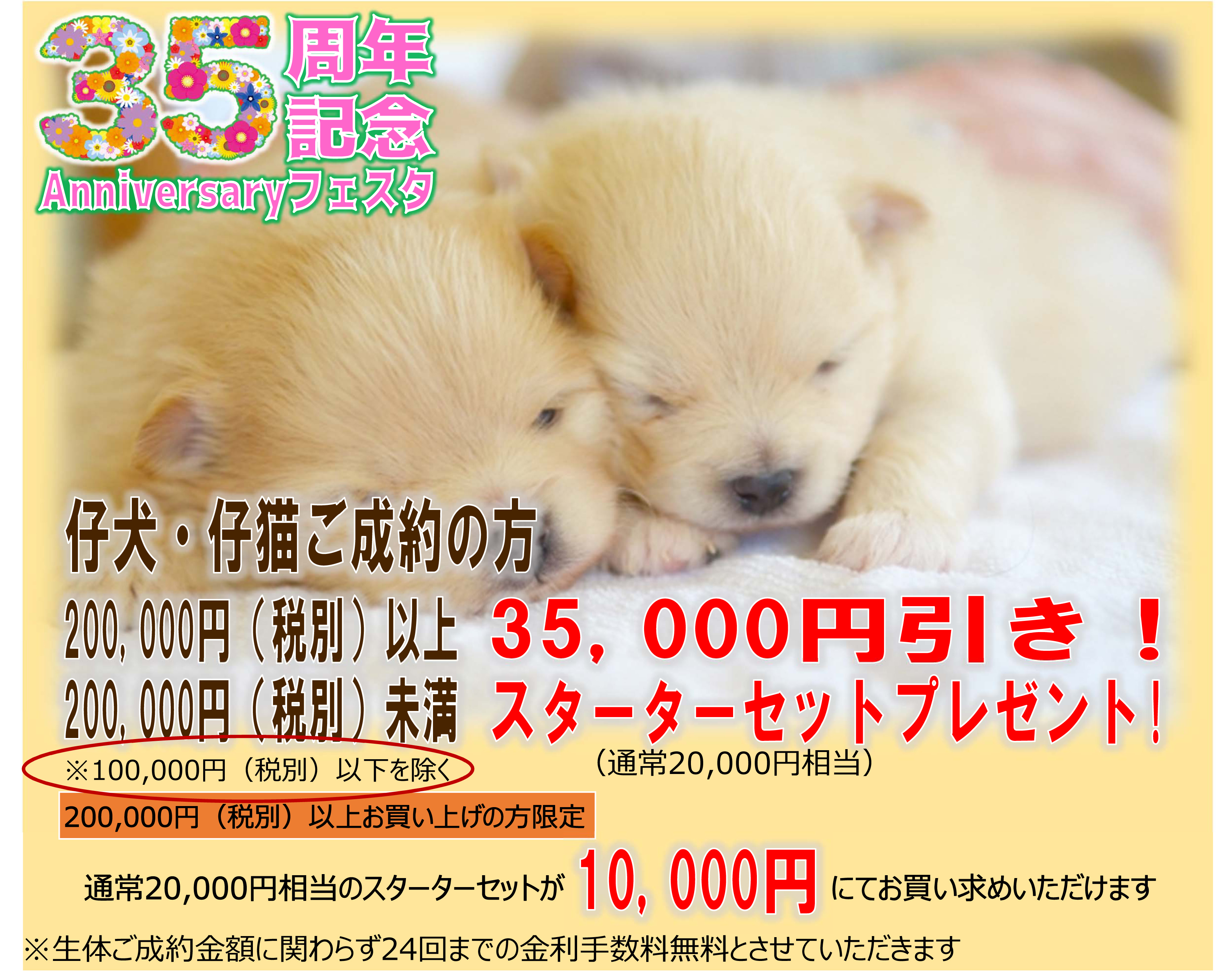 ワンダードック各店において、35周年記念アニバーサリーフェスタ好評につき 2021年1月11日まで延長!仔犬・仔猫ご成約の方にステキな特典がございます!